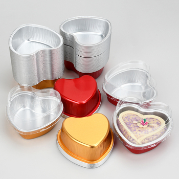 Confezione da 50 fogli di alluminio Mini teglie monouso a forma di cuore 3.4oz/100ml stampo per torta da forno vassoi per Cupcake con coperchi in plastica trasparente